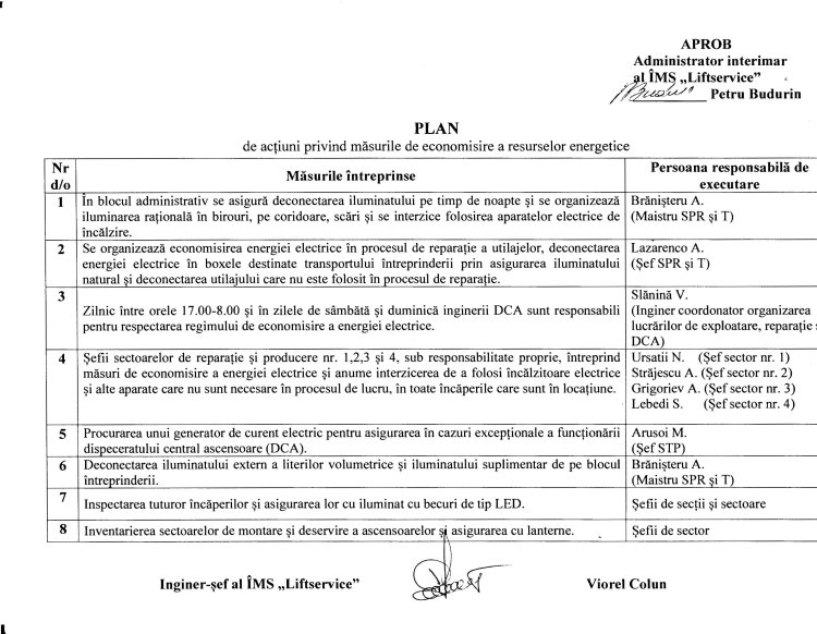 În legătură cu Hotărîrea Parlamentului privind declararea stării de urgență și a Comisiei pentru Situații Excepționale a mun. Chișinău, ÎMS "Liftservice" a elaborat planul de acțiuni privind măsurile de economisire a resurselor energetice.